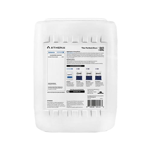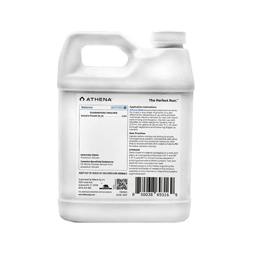 Athena Balance is a simple formula of potassium silicate specifically concentrated to buffer irrigation water and stabilize to ideal pH. Silicon additionally benefits plant growth, stem structure, stress reduction, water usage (osmoregulation), and nutrient utilization.